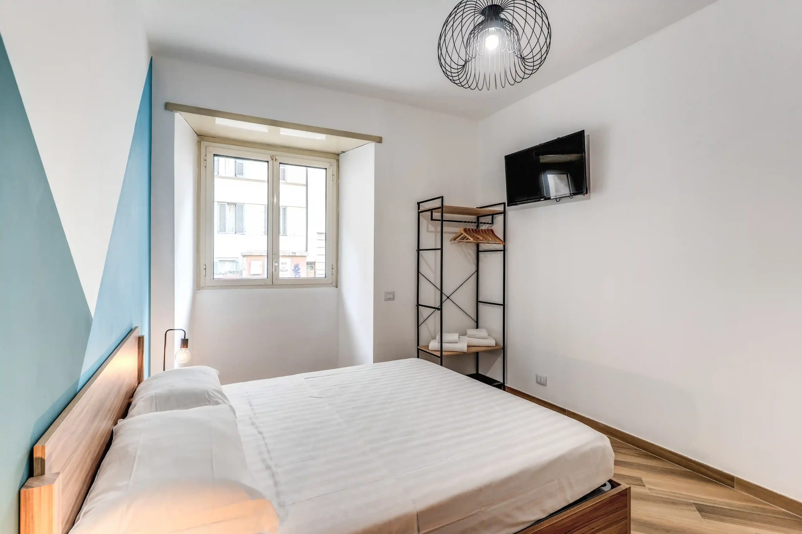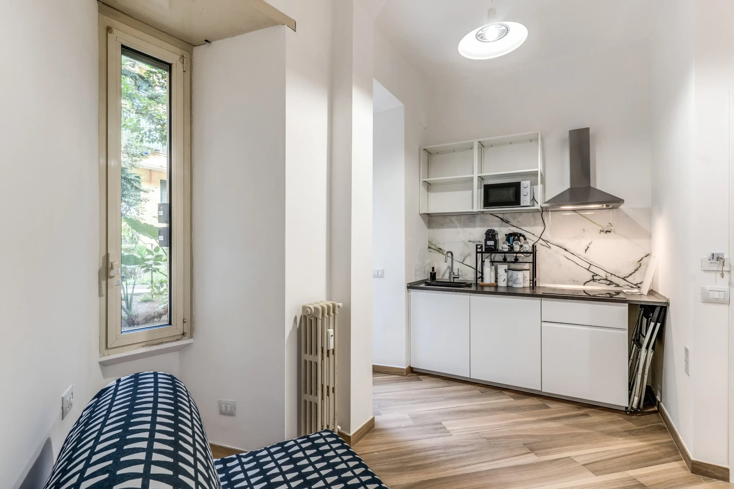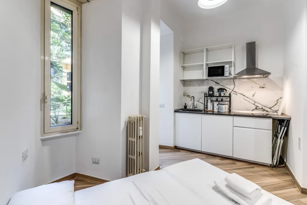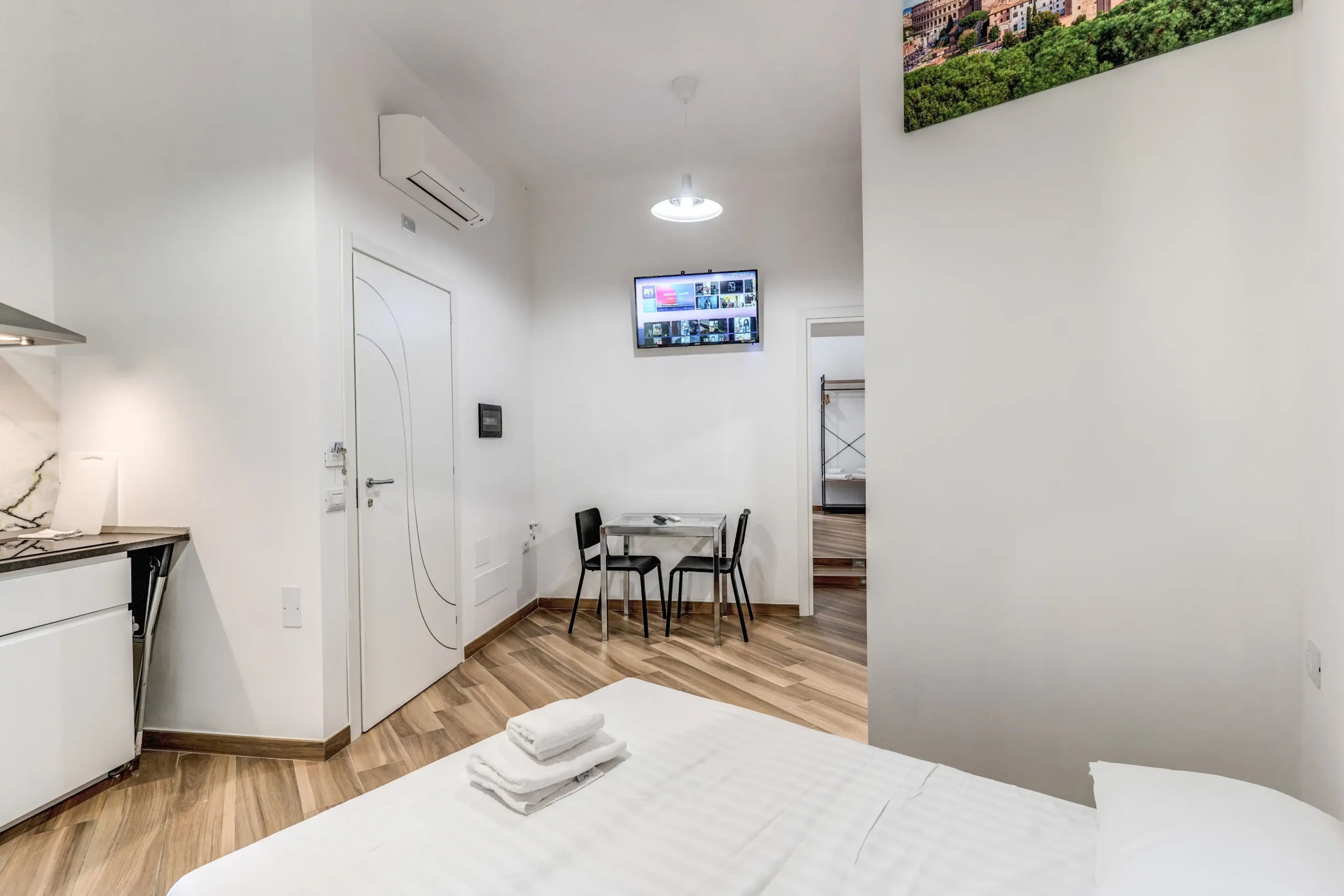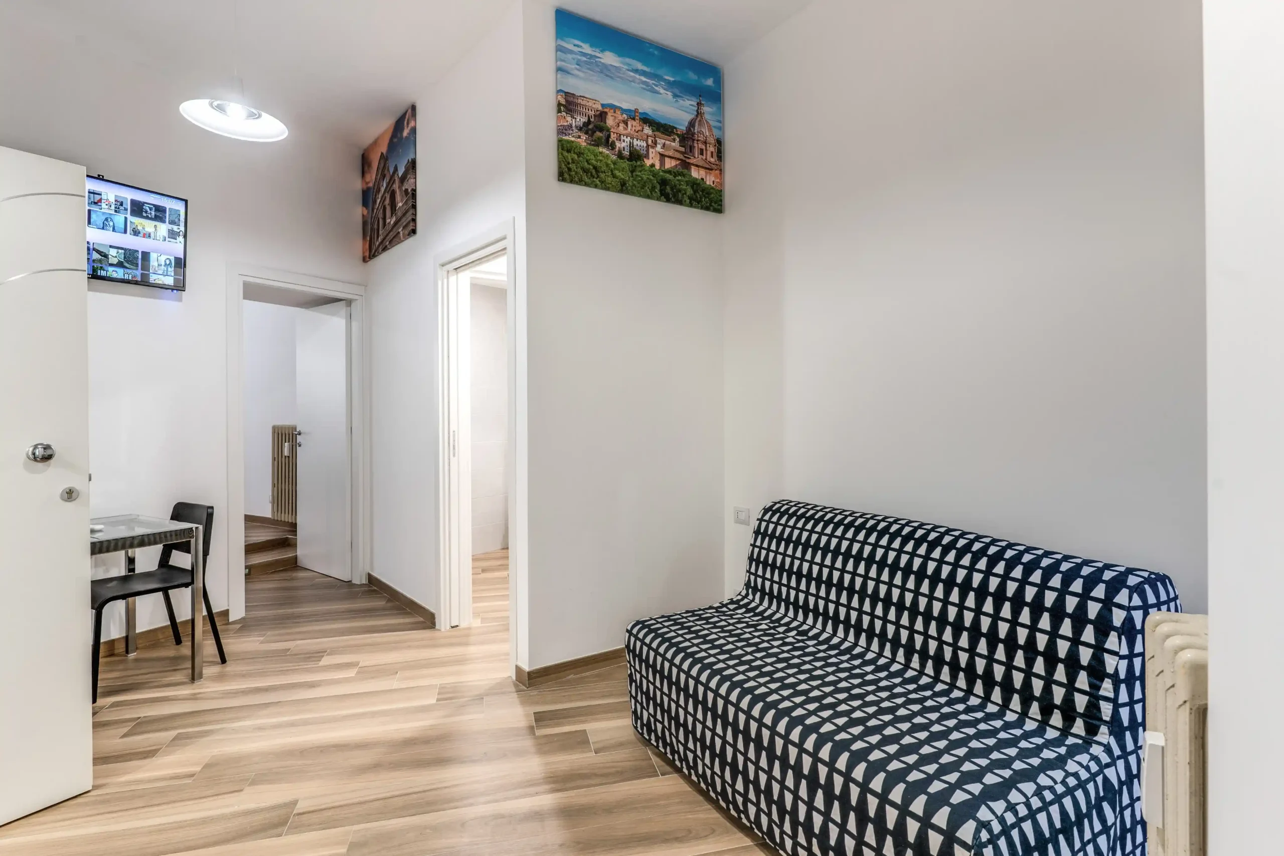 Bilocale elegante e moderno, ristrutturato nel 2025 con materiali di qualità e design contemporaneo. Ideale per 2 ospiti, offre camera matrimoniale, soggiorno con divano letto, cucina attrezzata e bagno privato. Perfetto per coppie o soggiorni di lavoro. Il prezzo base include 2 persone; fino a 1 ospite extra possono essere accolti su richiesta, con preparazione del divano letto e supplemento di 30€/notte per persona. Comfort, stile e funzionalità al centro del soggiorno.