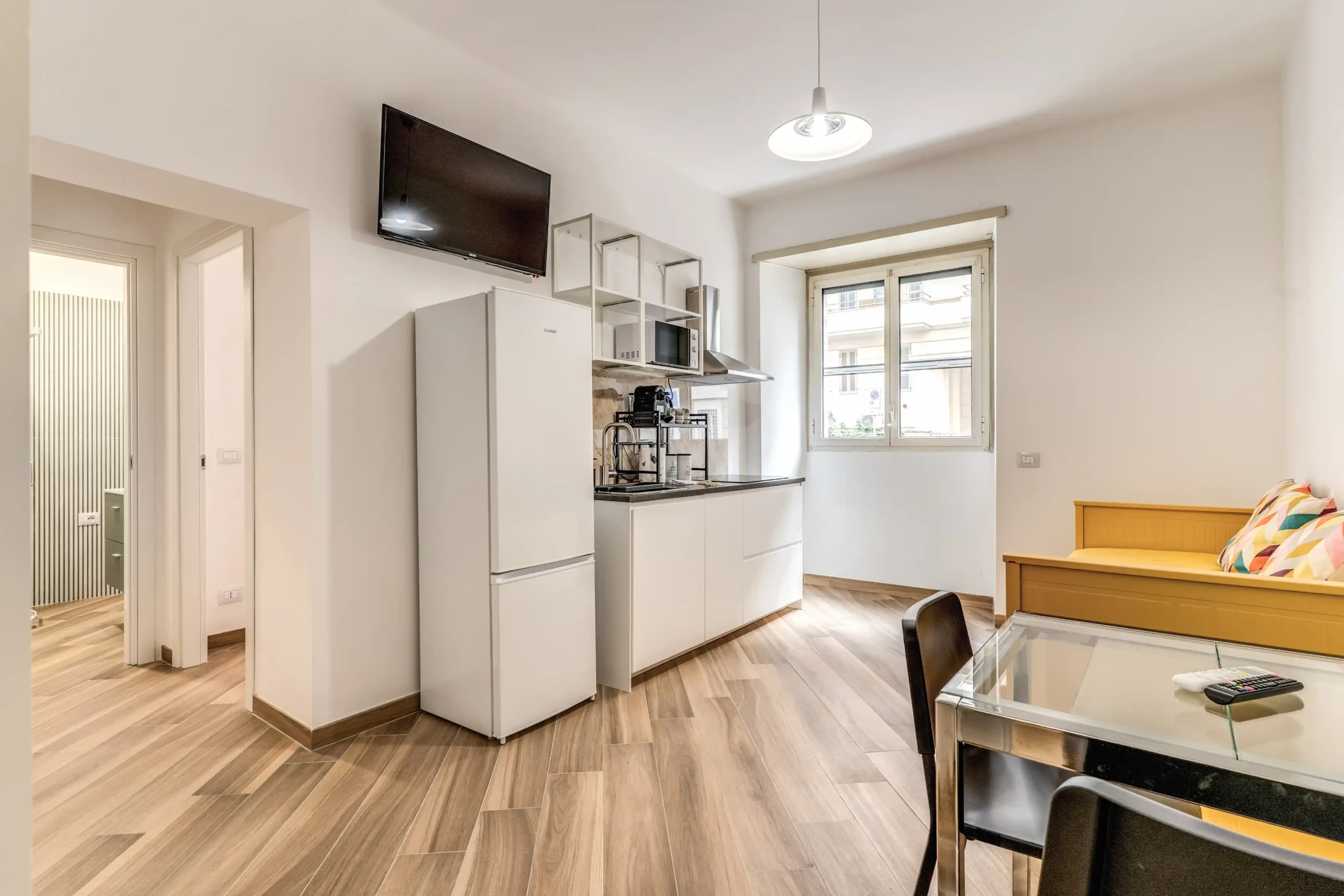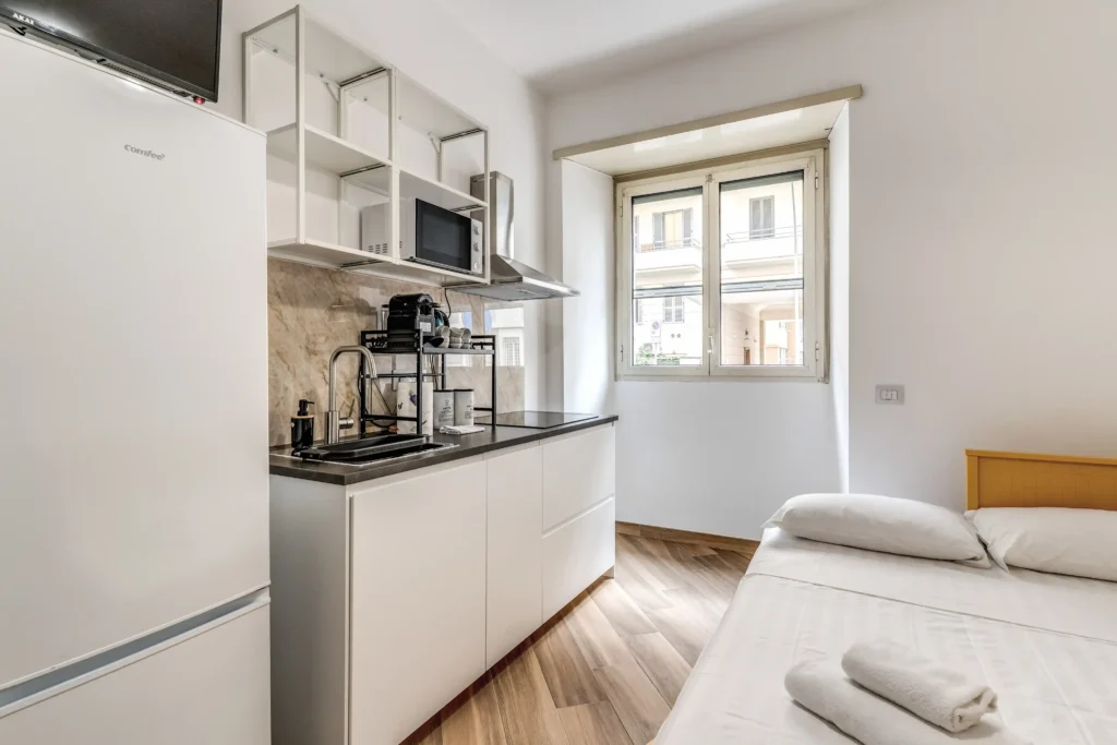 Bilocale elegante e moderno, ristrutturato nel 2025 con materiali di qualità e design contemporaneo. Ideale per 2 ospiti, offre camera matrimoniale, soggiorno con divano letto, cucina attrezzata e bagno privato. Perfetto per coppie o soggiorni di lavoro. Il prezzo base include 2 persone; fino a 1 ospite extra possono essere accolti su richiesta, con preparazione del divano letto e supplemento di 30€/notte per persona. Comfort, stile e funzionalità al centro del soggiorno.